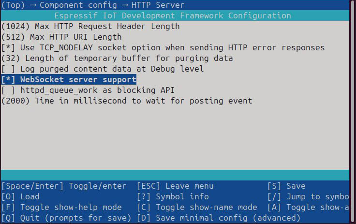 WebSocket Server. Компонент HTTP-сервера предоставляет поддержку WebSocket. Фича WebSocket может быть разрешена в menuconfig с помощью опции CONFIG_HTTPD_WS_SUPPORT.