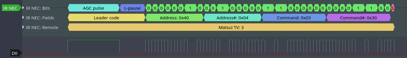 Полный пример кода можно найти в peripherals/rmt/ir_nec_transceiver. В приведенном выше куске кода мы использовали оператор switch-case и несколько goto для реализации машины состояния. По этому шаблону пользователи могут сконструировать более сложные IR-протоколы.