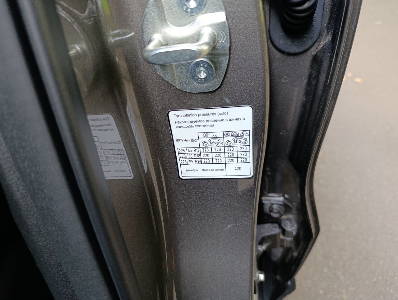 Если открыть дверку водителя, то на центральной стойке салона есть наклейка с памяткой о рекомендумом давлении в шинах.