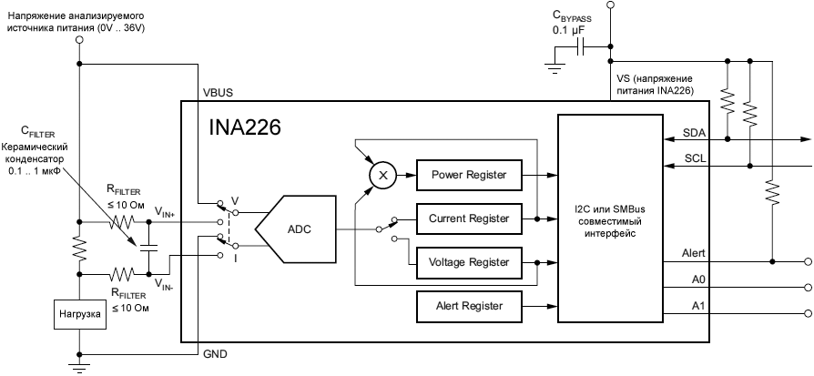 Рекомендации по источнику питания. Входная схема INA226 может точно измерять сигналы, напряжения которых превышают относительно земли уровень напряжения питания VVS. Например, напряжение питания VVS может быть 5V, в то время как измеряемое напряжение VBUS (относительно GND) может быть до 36V. При этом устройство может выдерживать полный диапазон уровней от 0V до 36V на своих входах, независимо от того, подано напряжение питания VVS, или нет.