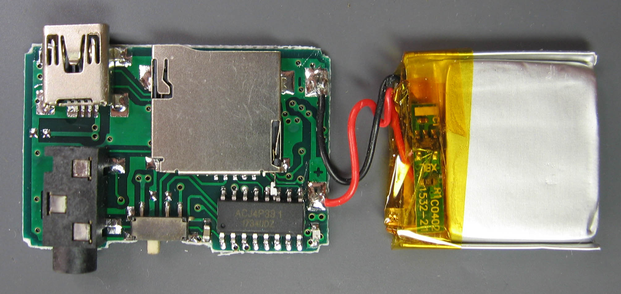 Аккумулятор применен неизвестной емкости, никаких надписей на нем нет. Судя по маленькой платке рядом с аккумулятором, работает аккумулятор вместе с контроллером зарядки и разряда - т. е. гарантируется отсутствие перезаряда и чрезмерного разряда. Когда аккумулятор полностью разряжен, напряжение на черном и красном проводе отсутствует. Ток заряда при полностью разряженном аккумуляторе начинается с 200 мА, и далее постепенно уменьшается до 5 мА (вероятно, столько тока потребляет красный светодиод плеера). Полная зарядка по времени занимает примерно пару часов, после чего падение тока останавливается.