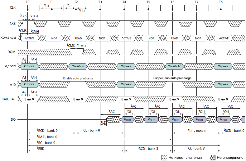Примечание 1: команда WRITE может быть выдана в любой банк, и команда READ может быть выдана в любой банк. В иллюстрации DQM=0, CL=2.