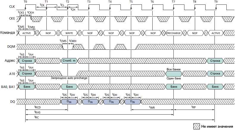 1. Должен пройти интервал tWR до выдачи команды PRECHARGE. 2. Страница остается открытой; нет времени tRP.