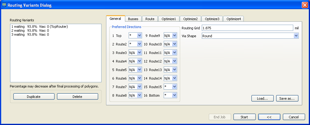 Вы можете использовать кнопки Load ... и Save as ... для загрузки разных наборов параметров из файла управления автотрассировщиком (Autorouter control file, *.ctl), или для сохранения текущих настроек для будущих проектов.