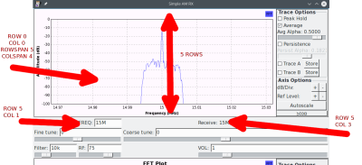 Если в параметре Grid Position используются 4 числа, то значение первых двух остается таким же (номер столбца и строки). Однако оставшиеся 2 числа задают, на сколько столбцов и строк продолжается блок GUI. Например, если на верхней строке формы есть 3 элемента управления - блока GUI (у которых параметры Grid Position [0,0], [0,1] и [0,2]), то можно управлять размерами блоков GUI в первом ряду, указывая Grid Position как [1,0,1,3] (здесь квадратные скобки указаны просто для удобочитаемости, на самом деле в параметре Grid Position их вставлять не надо). На картинке ниже показана в качестве примера окно запущенного GRC-проекта, где верхние пять строк графика FFT занимает 5 строк и 4 столбца. Важно помнить, что нумерация строк и столбцов начинается от нуля, так что следующая пустая строка после графика FFT будет 5, где размещено два GUI-блока, показывающие частоту (в столбцах 1 и 3).
