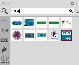 1.1. В системе Fritzing невозможно создать полностью "чистый" компонент, обязательно нужно выбрать для него прототип из палитры Parts. Для создания компонента платы AVR-USB32U4 я выбрал компонент IC из Core Parts. Перетащите компонент IC на поле Breadboard, и поменяйте у него имя chip label на AVR-USB32U4 и количество выводов на 32: