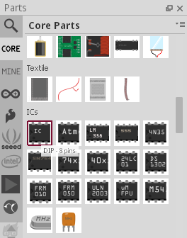 1.1. Запустите Fritzing, перейдите на закладку Breadboard. В браузере Parts выберите раздел CORE. Прокрутите список компонентов до раздела ICs (микросхемы).