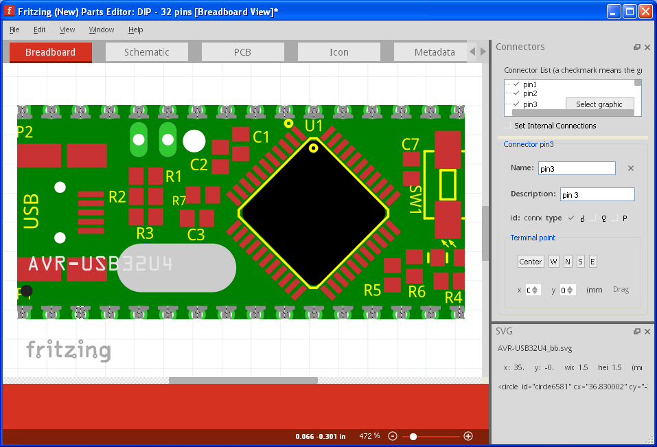 Теперь предстоит отредактировать векторное изображение в формате SVG - как будет выглядеть Ваш компонент в редакторе Fritzing Breadboard. Для редактирования файла SVG я советую использовать Inkscape [2] (см. также FAQ), подразумевается, что он у Вас уже установлен.