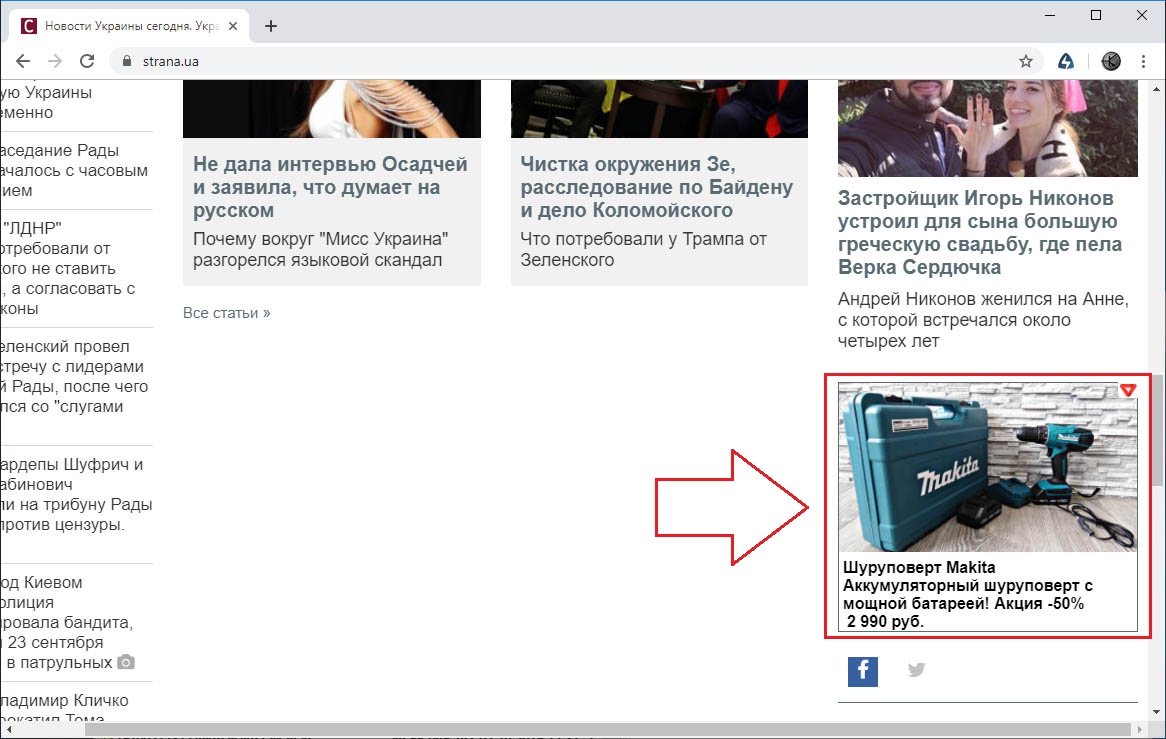 Вот так например выглядит эта рекламная ссылка мошенников на сайте strana.ua: