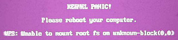 KERNEL PANIC! Please reboot your computer. VFS: Unable to mount root fs on unknown-block(0,0)
