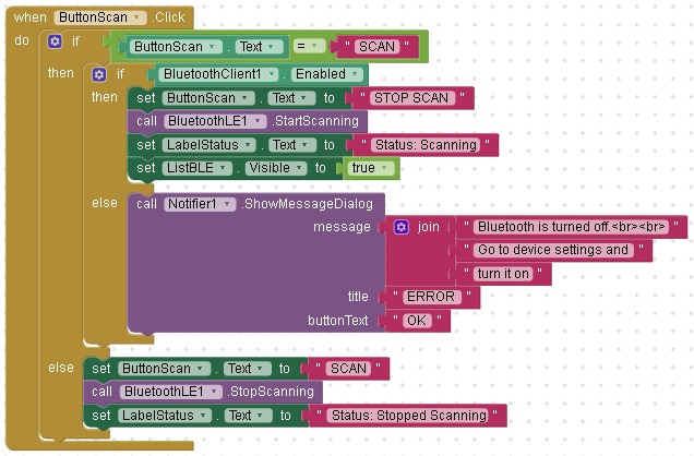 Теперь нам нужно поменять, что будет происходить по клику на кнопке Scan. Когда на этой кнопке осуществлен клик, нам сначала надо проверить, разрешен ли Bluetooth, если разрешен, то можно сканировать. Если нет, то нам нужно выдать сообщение об ошибке. Проверка, разрешен ли Bluetooth, делается с помощью блока BluetoothClient.Enabled.