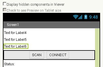 Откройте App Inventer, откройте aia-файл BaseConnect, и сохраните его как ARD_HM10_AI2_Single_LED_01.aia. Модуль HM-10 доступен для подключения на устройстве Android, если использовать приложение MIT AI2 Companion. Кликните Scan, и увидите, какие устройства можно найти в сети Bluetooth BLE.