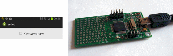 Ниже показан интерфейс программы Android и соответствующее состояние светодиода на макетной плате.