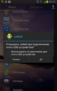 Примечания к коду usbOpenDevice: функция работает с глобальными переменными usbmanager, usbdev, usbif, usbep. Если удалось открыть устройство USB, то возвращает true, и переменные находятся в рабочем состоянии, готовые к работе. Иначе будет возвращено false. Для опроса устройств, интерфейсов и конечных точек используются циклы, которые строго говоря применять необязательно, так как у нас всегда только одно устройство, и мы заранее точно знаем его параметры. Процедура clog выводит информационные сообщения в текстовую консоль, и её использование необязательно. Метод hasPermission класса UsbManager определяет, получено ли от пользователя разрешение на подключение к устройству или нет. Окно на запрос разрешения выводится примерно в таком виде: