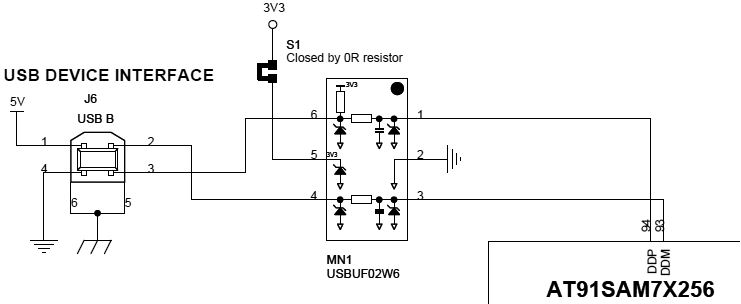 Дополнительные подробности по поводу реализации аппаратуры устройства USB см. в специальном документе Product Properties (свойства продукта, под продуктом подразумевается микроконтроллер ARM компании Atmel). Физический приемопередатчик (transceiver) интегрирован в микроконтроллер. Двунаправленные дифференциальные сигналы DP и DM также выведены наружу через выводы микроконтроллера DDP и DDM.