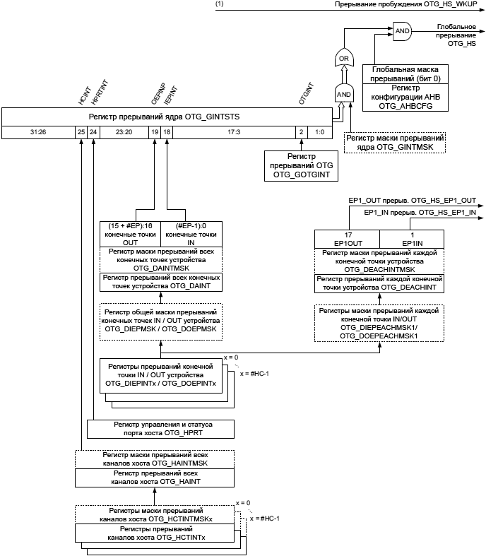 Регистры прерывания конечной точки x устройства (DIEPINTx/DOPEPINTx) показывают статус конечной точки по отношению к событиям USB и AHB. Приложение должно прочитать эти регистры, когда установлен бит прерывания OUT или IN endpoint в регистре прерываний ядра (бит OEPINT в регистре OTG_HS_GINTSTS или бит IEPINT в регистре OTG_HS_GINTSTS, соответственно). Перед тем, как приложение может читать эти регистры, оно должно сначала прочитать регистр прерывания всех конечных точек (OTG_HS_DAINT), чтобы узнать точный номер регистра прерывания конечной точки X устройства. Приложение должно очистить подходящие биты в этом регистре, чтобы очистить соответствующие биты в регистрах DAINT и GINTSTS.
