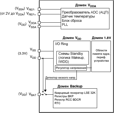 Блок часов реального времени (real-time clock, RTC) и регистры резервного хранения (backup) могут получать питание от отдельного напряжения VBAT, когда основной источник питания VDD выключен.
