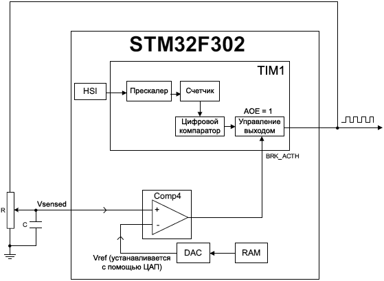 Рис. 34 показывает упрощенную диаграмму приложения примера, которое периодически генерирует N импульсов. Генерируемый сигнал выводится через ножку PA.08 микроконтроллера STM32F302, которая выведена на вывод 8 коннектора CN9.
