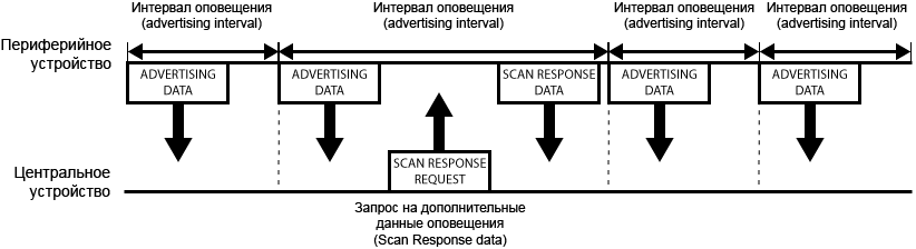 Периферийное устройство установит специальный интервал оповещения (advertising interval), и всякий раз по истечении этого интервала будет повторно передавать основной пакет оповещения (main advertising packet). Чем больше интервал оповещения, тем больше экономится энергия источника питания, однако устройство будет труднее найти в сети, если оно будет оповещать о себе каждые 2 секунды по сравнению с оповещением о себе каждые 20 миллисекунд.