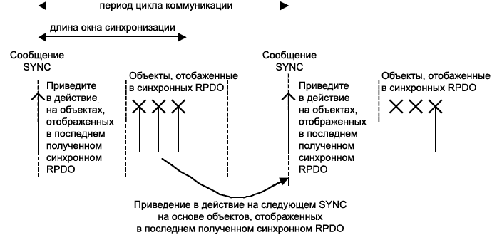Коммуникационная модель поддерживает передачу синхронных и асинхронных сообщений. Методом передачи синхронного сообщения становится возможным осуществление координированного по всей сети запуска сбора и обработки. Синхронная передача сообщений поддерживается заранее определенными в стандарте коммуникационными объектами: сообщение синхронизации (SYNC), сообщение метки времени (time stamp). Синхронные сообщения передается по заранее определенному сообщению синхронизации, асинхронное сообщение может быть передано в любой момент времени.