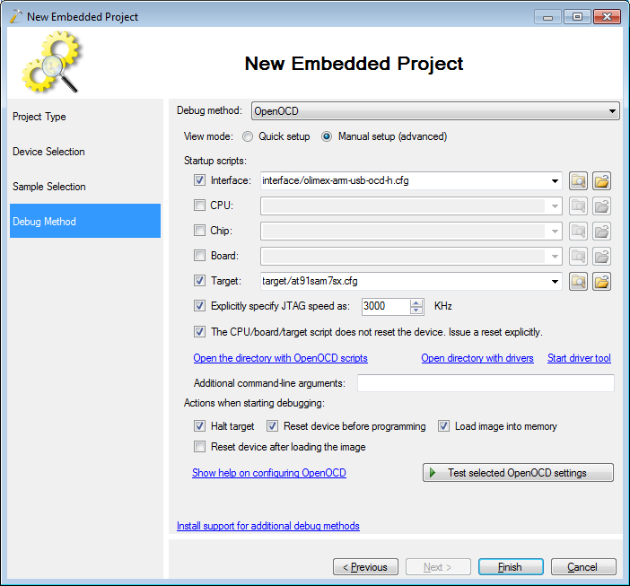 8. Последняя страница позволяет выбрать метод отладки. Мы будем использовать инструментарий OpenOCD для отладки с использованием программатора Olimex ARM-USB-OCD-H. Если у Вас еще не установлена система OpenOCD, кликните "Install support for additional debug methods", выберите "OpenOCD" и кликните OK: