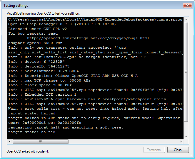 10. Подключите Ваш программатор JTAG к отлаживаемой плате, подайте на неё питание и нажмите "Test selected OpenOCD settings". Если у Вас не установлен драйвер FTDI, то VisualGDB установит его для Вас. Успешный результат теста будет выглядеть примерно так: