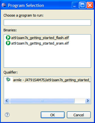 Здесь есть 5 закладок, хранящих информацию конфигурации отладки. На первой в поле "C/C++ Application" должен быть указан двоичный файл для отладки. Если проект был собран без ошибок, то кнопка "Search Project..." должна показать список возможных файлов для выбора. Пример Getting Started для AT91SAM7S собирает 2 файла, один для выполнения в SRAM, и другой для выполнения во FLASH. Для этой конфигурации должен быть выбран первый, для SRAM.