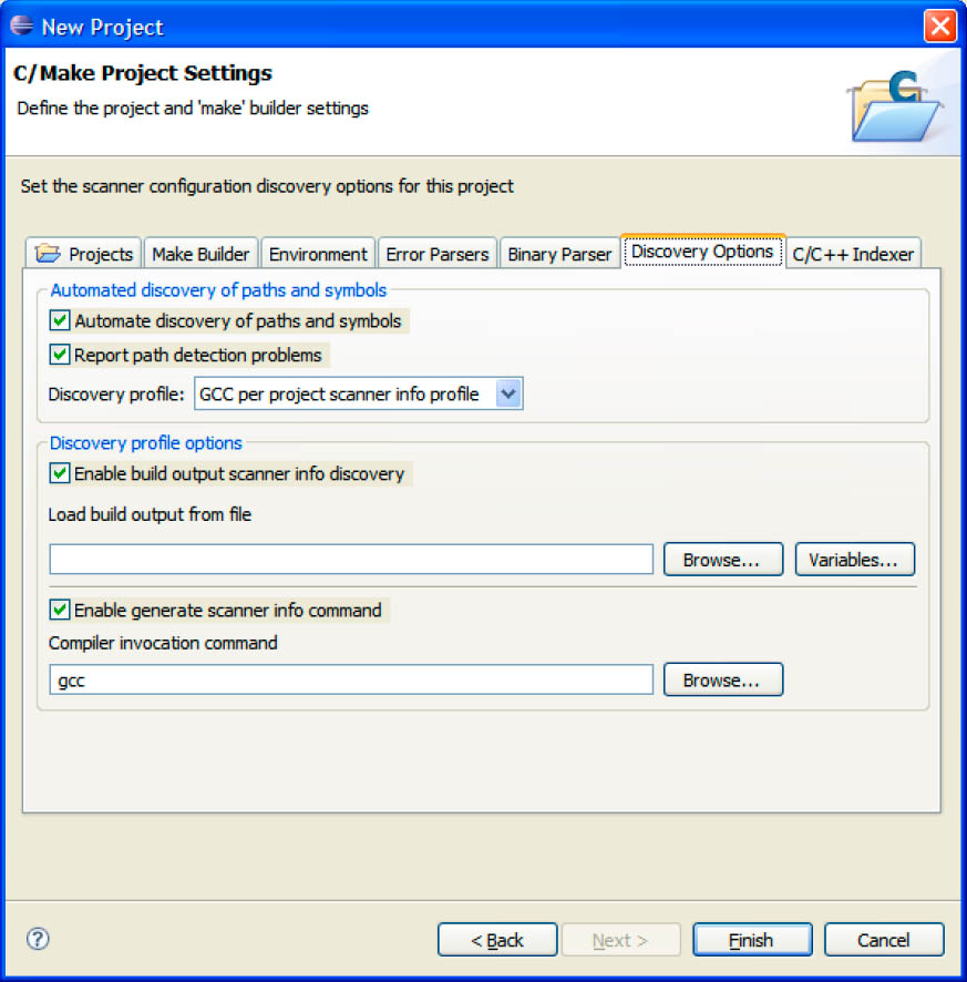 Следующая закладка "Discovery Options". По умолчанию включена опция автоматического определения путей и символов, что разрешает системе Eclipse собрать список функций, переменных проекта, и т. д. Это полезно для быстрой навигации по коду, и лучше эту опцию оставить разрешенной. Единственная модификация здесь - изменить значение поля "Compiler invocation command" с gcc на arm-elf-gcc, поскольку проект использует компилятор GNU ARM, а не стандартный.