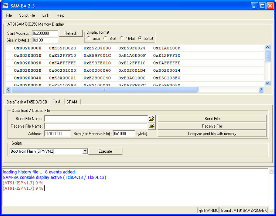 Для выполнения прошивки используется требуется соответствующий скрипт. Пример Getting Started предоставляется вместе со скриптом, который помещает двоичный файл в память FLASH и запускает его, и этот скрипт можно запустить из командного файла (*.bat или *.cmd). Подробнее про написание скриптов см. руководство пользователя SAM-BA [2].