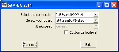 4. Запустите файл sam-ba_cdc_2.9.xp_vista.exe. Выберите в выпадающем списке нужный COM-порт и плату at91sam9g45-ek (или sk-(m)at91sam9g45). Нажмите кнопку Connect. Как вариант, для SAM-BA можно подключиться не через USB, а через порт DBGU.