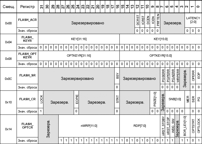 LOCK (бит 31): Lock, блокировка. Записывается только в лог. 1. Когда установлен, этот бит показывает, что регистр FLASH_CR заблокирован. Бит LOCK очищается аппаратно после детектирования специальной последовательности действий по разблокировке. После неудачной операции разблокировки этот бит останется установленным до следующего сброса (т. е. FLASH_CR нельзя разблокировать, пока не произойдет сброс).
