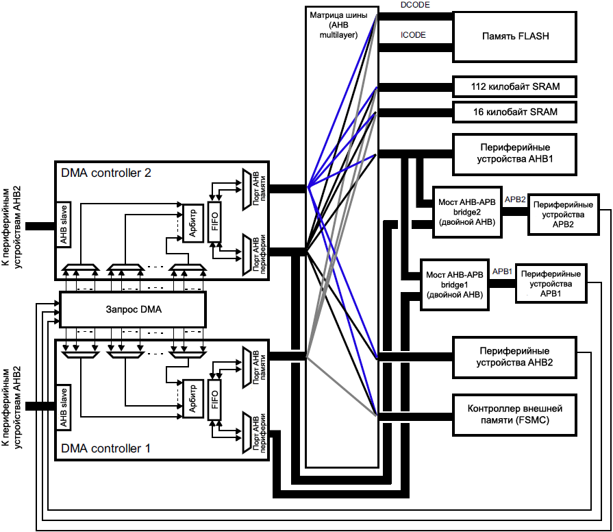 Примечание: AHB порт периферии контроллера DMA1 не подключен к матрице шины, как контроллер DMA2. В результате только потоки DMA2 могут выполнять передачи память-память.