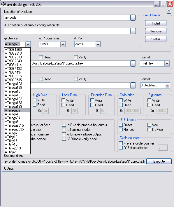 В режиме USB HID программатор работает намного быстрее, чем в режиме USB CDC с программами AVR Studio и BASCOM-AVR. Поэтому для часто повторяющихся операций лучше всего выбрать avrdude. Имеется также написанная для avrdude графическая оболочка avrdude-gui.exe.