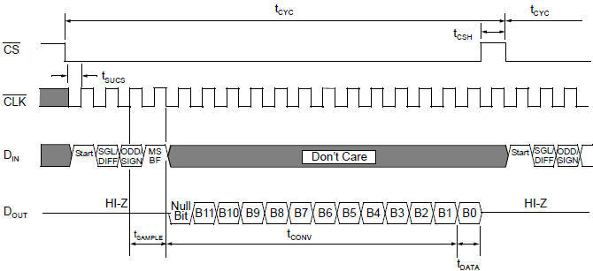 Используемый протокол обмена данными максимально прост. Сначала по шине DI идут 4 бита команды, потом по шине DO выдвигаются из АЦП 12 бит данных (каждый бит команды DI и каждый бит данных DO тактируется фронтом сигнала CLK). Данные передаются в порядке, когда самый старший бит идет первым (MSBF, Most Significant Bit First).