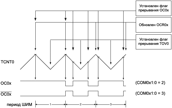 Флаг переполнения Timer/Counter Overflow (TOV0) устанавливается каждый раз, когда счетчик достигает BOTTOM. Флаг прерывания может использоваться для генерации прерывания каждый раз, когда счетчик достигает значения BOTTOM. Сравните с Fast PWM mode: там флаг TOV0 устанавливается, когда счетчик достигает значения TOP.