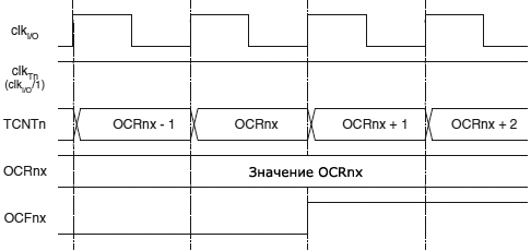 Изменение состояния битов COM0x1:0 даст эффект на первом событии Compare Match после того, как биты были записаны. Для режимов не-PWM действие может быть реализовано немедленно с использованием битов стробирования FOC0x.