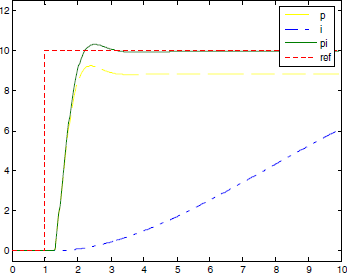 Пропорциональное условие (P) подает на вход системы значение, пропорциональное ошибке. Использование только P-управления дает постоянную ошибку во всех случаях кроме тех, когда управляющий вход системы равен 0, и выходное отслеживаемое значение равно требуемому. На рисунке 2-3 статическая ошибка появляется после того, как изменилось требуемое (опорное, reference, ref) значение. Использование слишком большого коэффициента P-регулирования (Tp) в PID-регуляторе делает систему управления нестабильной.