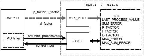 На рис. 3-1 показана упрощенная схема демо-приложения [2]. PID-регулятор использует структуру (struct) для сохранения своего состояния и параметров. Эта структура инициализируется в теле функции main, и функциям Init_PID() и PID() передается только указатель на структуру.