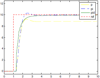 Примечание к рис. 1-1: ref - входное отслеживаемое воздействие, pi - отклик пропорционально-интегрального регулятора, p - отклик пропорционального регулятора, pid - отклик PID-регулятора.
