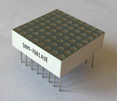В матрице GNM-7881AUE 64 красных светодиода. Если выводить из матрицы контакты всех светодиодов для управления каждым по отдельности, то понадобится как минимум 65 внешних контактов на корпусе матрицы, а также микроконтроллер с 64 портами вывода. Несомненно, это технологически реализовать очень трудно (и нецелесообразно). Поэтому на заводе светодиоды объединили в 8 групп по строкам и столбцам, и соединили их в матрицу следующим образом: