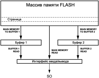 Main Memory Page to Buffer Transfer. Внутренняя машина состояния Serial DataFlash может автоматически скопировать данные из основной памяти в один из буферов, 1 или 2. Это дает возможность модифицировать один или несколько байт на странице основной памяти через модификацию буфера, и затем записать этот буфер обратно в основную память.