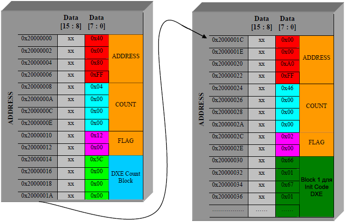 После того, как хост отправит 4-байта блока Init Code DXE Count, он пошлет 10 байт заголовка Block 1 Init Code DXE, и затем само содержимое Block 1.