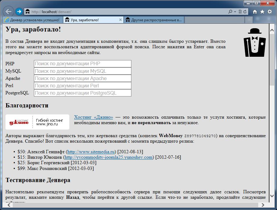 2. Скачайте и установите Denwer [1]. При установке можно принять все рекомендуемые настройки по умолчанию. Запустите Denwer, проверьте. Должны нормально отображаться ссылки http://localhost/denwer/ и http://test1.ru/