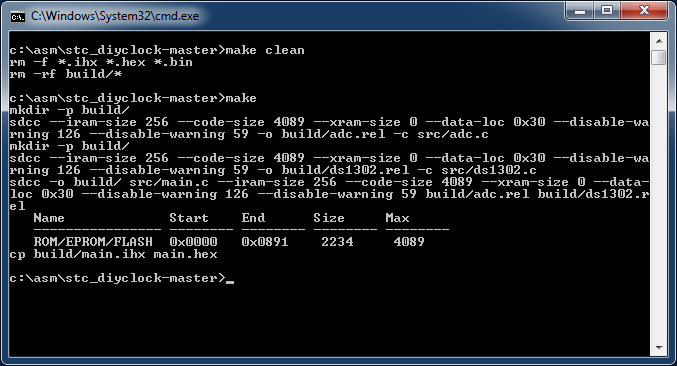 3. Перейдите в корневую папку распакованного проекта stc_diyclock-master (где находится файл Makefile), откройте интерпретатор командной строки cmd.exe, и выполните в этой папке 2 команды, одну за другой:
