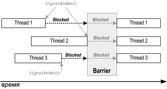 • Оператор блокировки lock (Monitor.Enter/Monitor.Exit). • Все методы класса Interlocked (что будет рассмотрено далее). • Асинхронные функции обратного вызова (callback), которые используют пул потоков. Это включает асинхронные делегаты, функции обратного вызова APM, продолжения Task. • Установка и ожидание конструкции сигнализации. • Все что полагается на сигнализацию, что запускает Task и ждет Task.